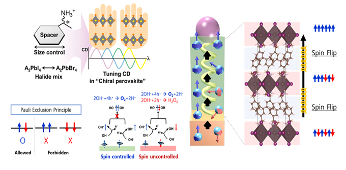 Since the chirality-induced spin selectivity (CISS) effect is based on the chirality of the organic molecules, inorganic semiconductor materials are rarely considered to exhibit chiral properties. However, in 2017, we firstly reported that remarkable chiral optical properties (g-factor) could be developed in organic-inorganic hybrid perovskite (OIHP) semiconductors through a chiral transition. Our group utilizes a CISS effect for enhancing hydrogen generation efficiency, while suppressing side reactions in photoelectrochemical (PEC) water splitting. A recent study has discovered the spin-filter technology that allows only electrons having a spin in a specific direction to be selectively transferable. It is also possible for us to develop a stacked spin-control system based on the chiral 2 dimensional (2D) perovskite on top of the photoelectrode. Due to the high CISS effect (> 80 %) of chiral perovskite semiconductors, it is expected that an innovative spin-driven green hydrogen-producing water splitting device could be realized if the spin-alignment of electrons is effectively controlled when combined with PEC water splitting device.